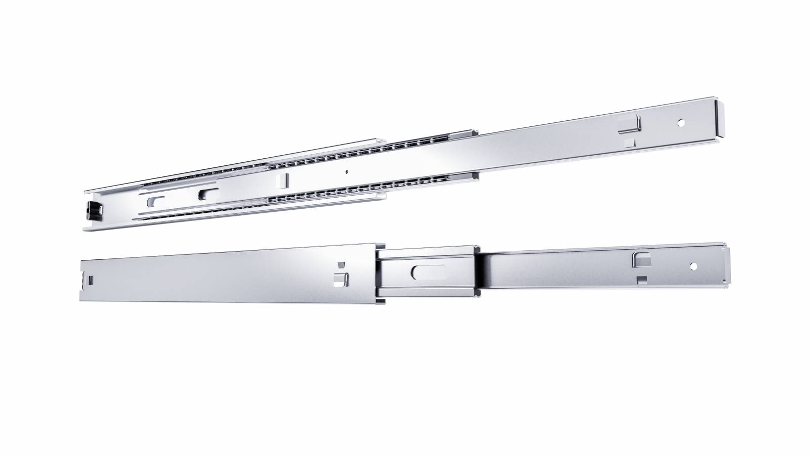 The T45-M-MX full-extension ball-bearing slides are engineered specifically for metal drawers. They feature both internal and external hooks that ensure a solid, stable anchor when the entire assembly—drawer and housing—is made of metal. This makes them ideal for applications demanding high strength and long-term durability.