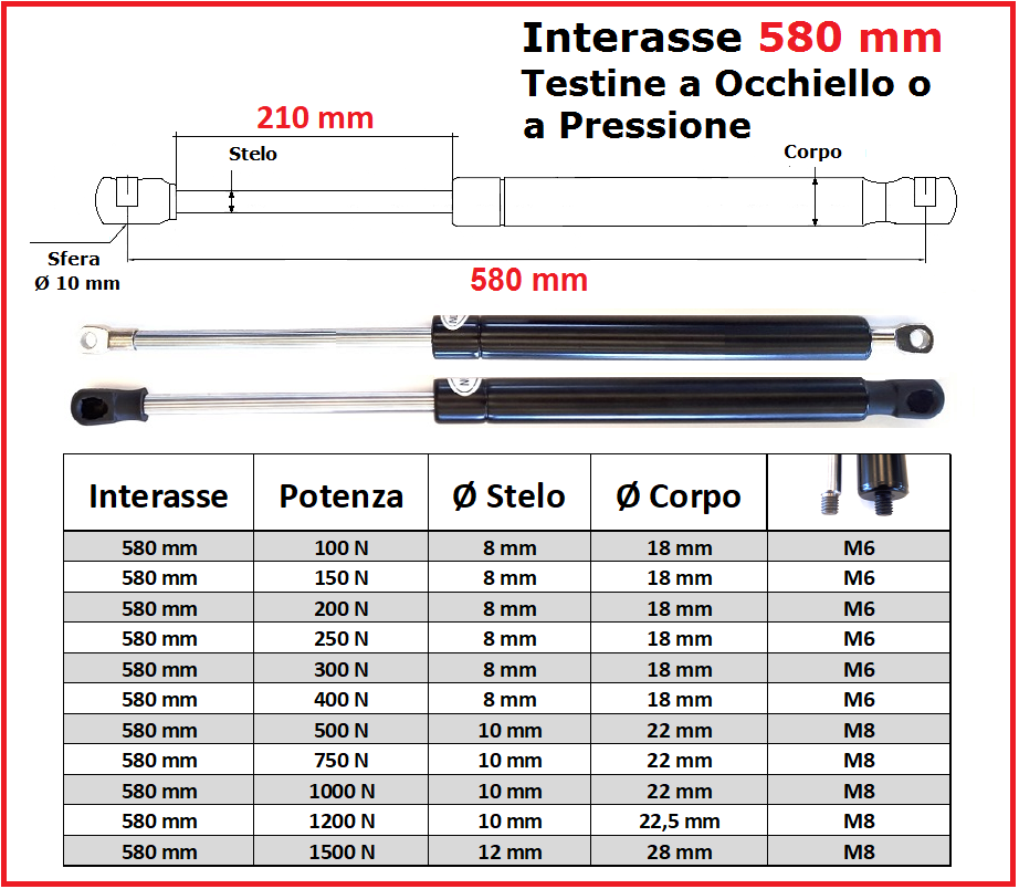 Il pistone a gas con interasse di 580 mm e una corsa di 210 mm, è progettato per soddisfare le esigenze di sollevamento e supporto in molteplici contesti. La possibilità di fissaggio con occhiello Ø8,2 mm o testine a pressione lo rende estremamente versatile e facile da installare.